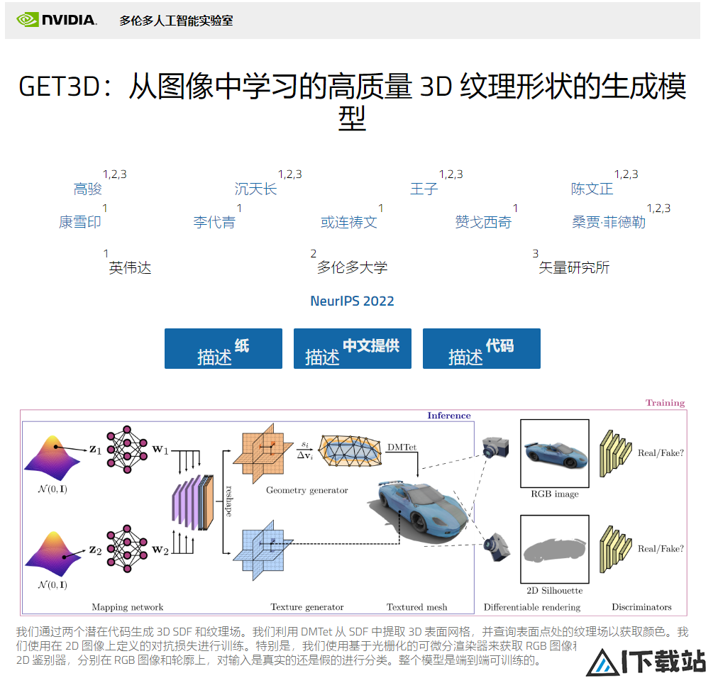 我们通过两个潜在代码生成 3D SDF 和纹理场。我们利用 DMTet 从 SDF 中提取 3D 表面网格,并查询表面点处的纹理场以获取颜色。我们使用在 2D 图像上定义的对抗损失进行训练。特别是,我们使用基于光栅化的可微分渲染器来获取 RGB 图像和轮廓。我们利用两个 2D 鉴别器,分别在 RGB 图像和轮廓上,对输入是真实的还是假的进行分类。整个模型是端到端可训练的。